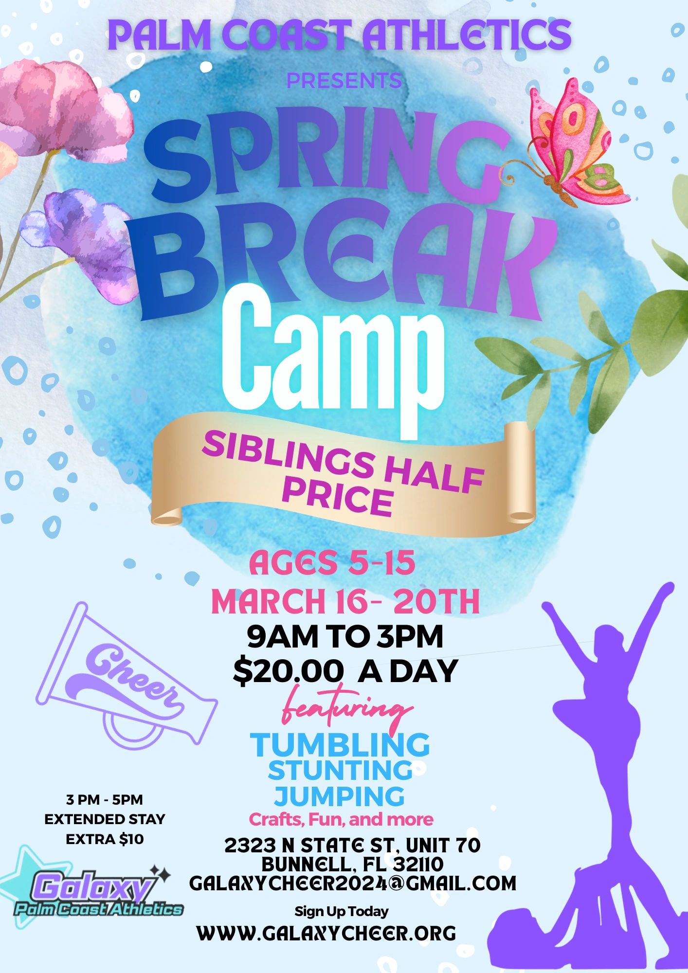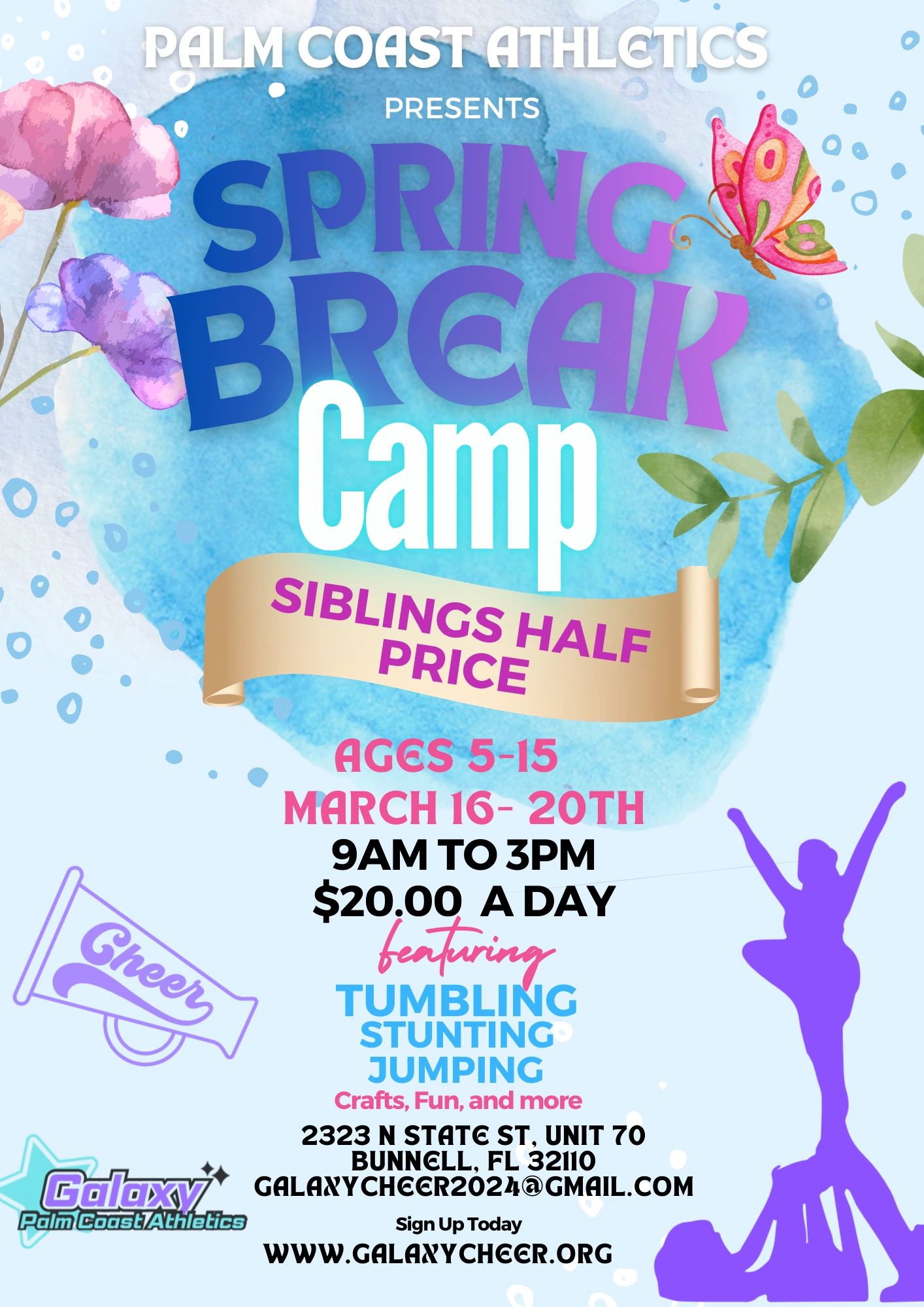 9 a.m.–3 p.m. Camp includes tumbling, stunting, jumping, games, crafts, and more. Just $20 per day, with siblings half price. Safe, fun spring break care for families.